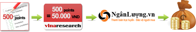 - Hình thức thanh toán: sau khi số điểm của bạn đủ để đổi thẻ (500 ponts = 50.000 VND), các bạn tiến hành đổi và mã số thẻ nạp sẽ được gửi đến số điện thoại hoặc email đăng ký của bạn từ sau 3 – 7 ngày đăng ký. Nếu ko thấy gửi các bạn có thể gửi mail đến địa chỉ support@vinaresearch.net yêu cầu kiểm tra, sẽ được giải đáp ngay. Hoặc bạn có thể đổi qua tài khoản Ngân Lượng